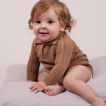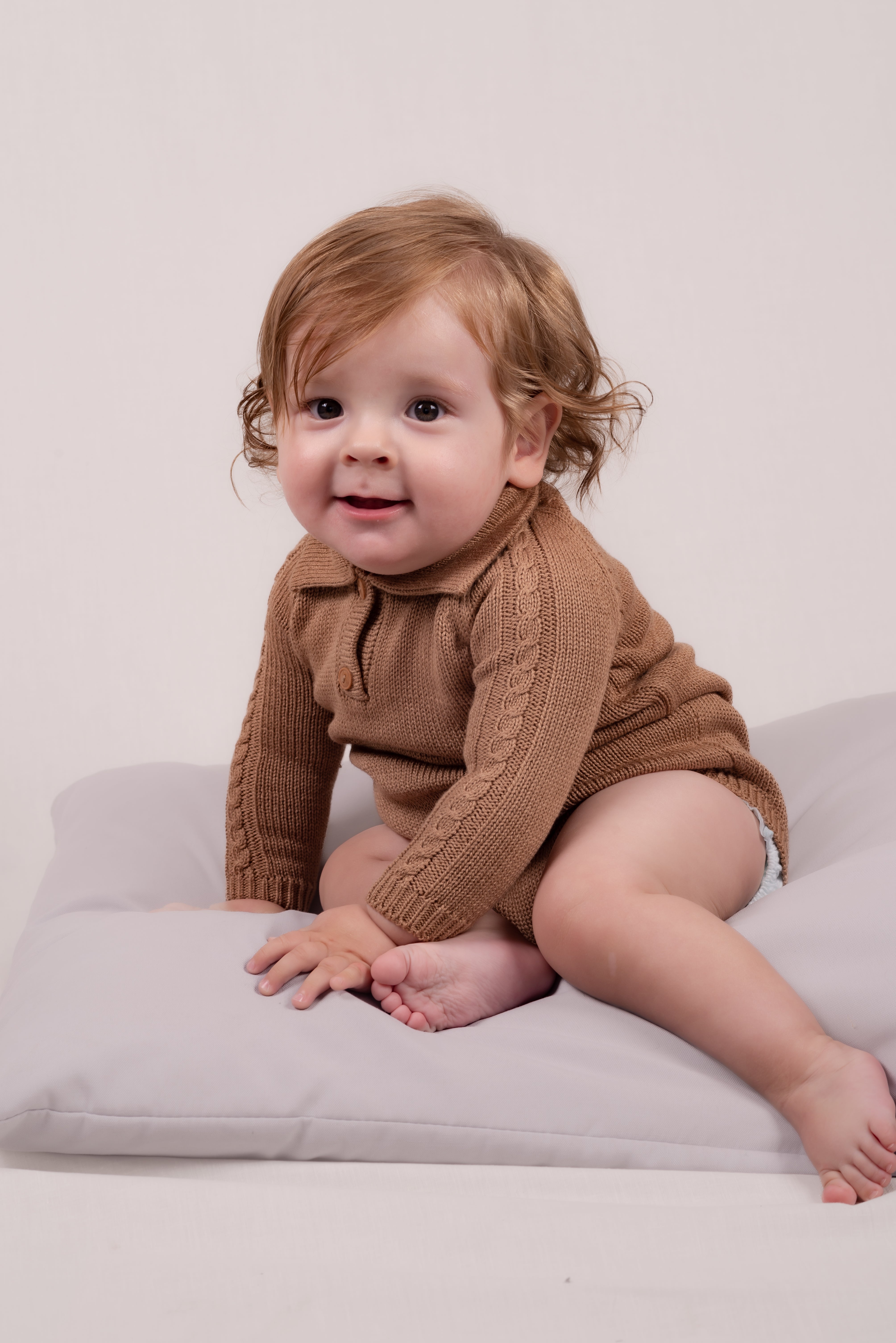 Un clásico polo, pero en versión bodysuit tejido para tu bebé. Este polo bodysuit knit en color camel tiene cuello tipo camisa, abertura con botones en el pecho y mangas largas con delicados detalles trenzados que lo hacen ver elegante y al mismo tiempo muy tierno.