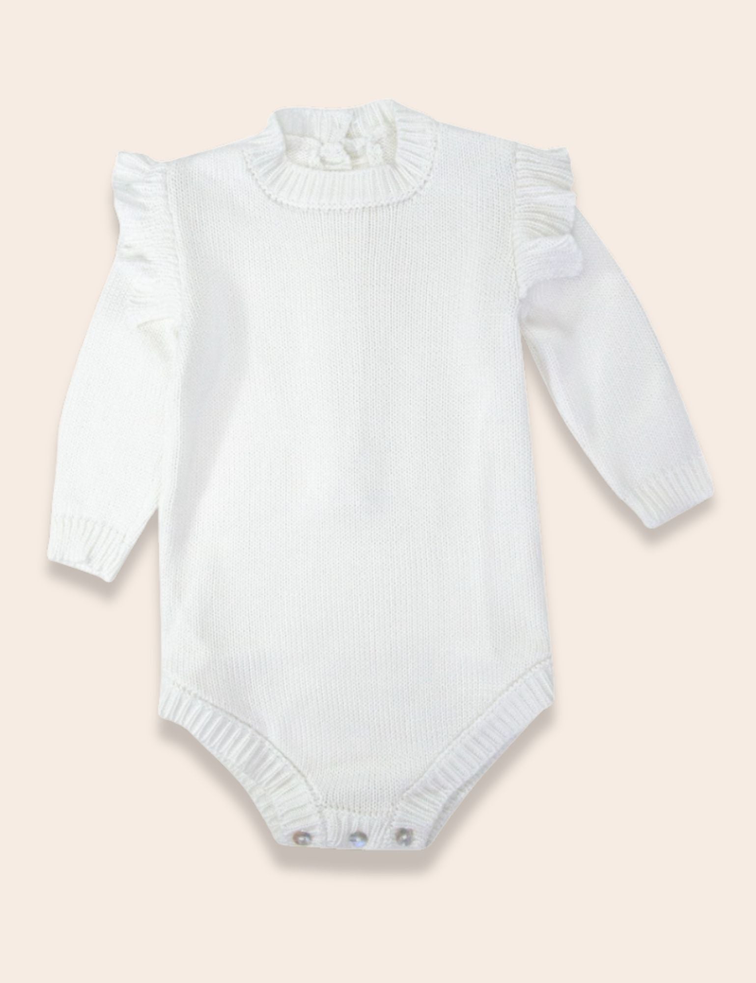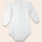 Un bodysuit delicado y romántico para las pequeñas de la casa. Este ruffle bodysuit knit en color ivory tiene volantes en los hombros, mangas largas y cuello tejido acanalado que enmarca la carita de tu bebé de forma súper dulce .