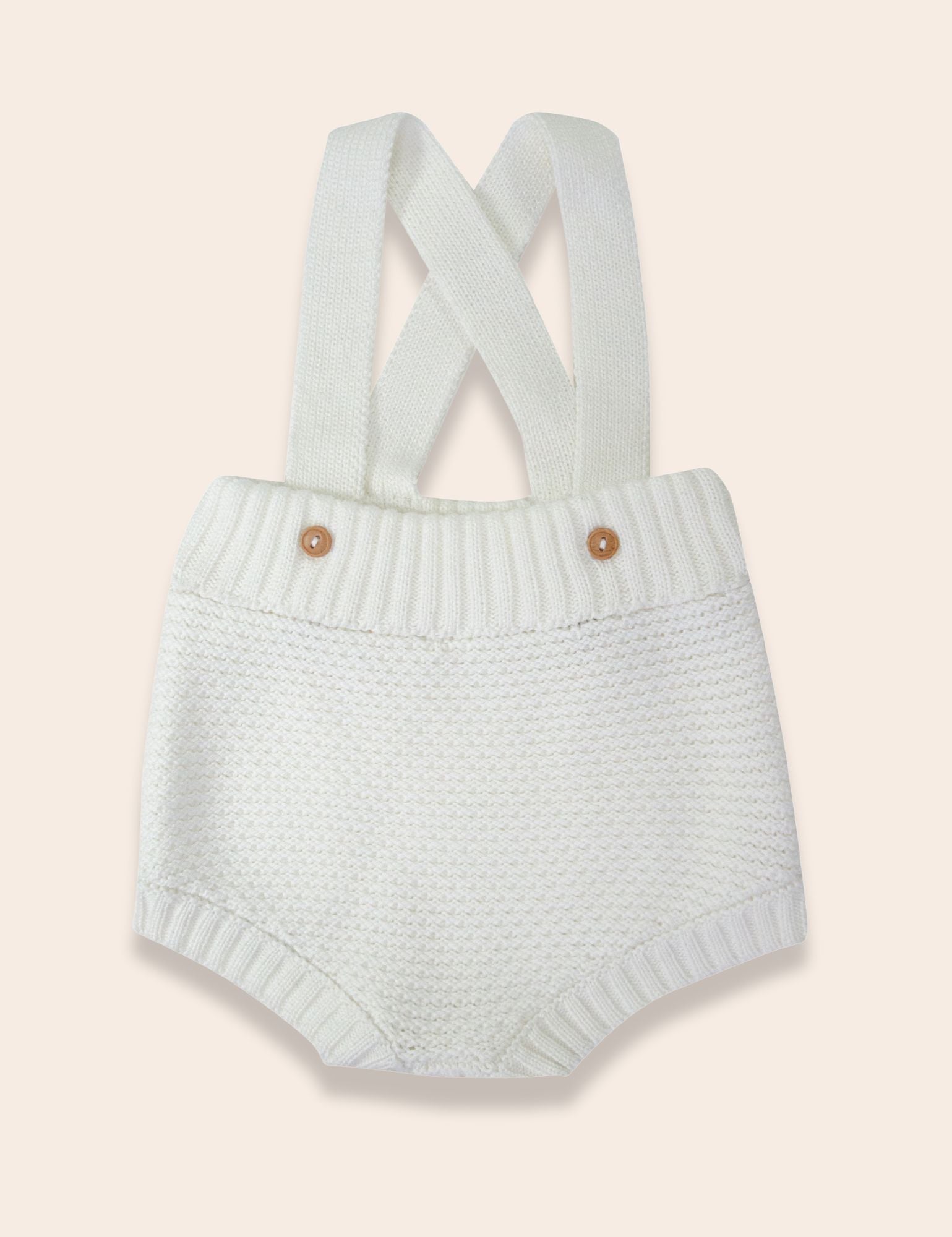 Un básico encantador para crear looks dulces y luminosos. Estos suspender bloomers knit en color ivory combinan la silueta tipo bloomer con tirantes tejidos cruzados que aportan un aire clásico y muy tierno . El tejido en punto textura y la pretina acanalada ayudan a que la prenda quede en su lugar mientras tu bebé se mueve, gatea o da sus primeros pasos.