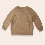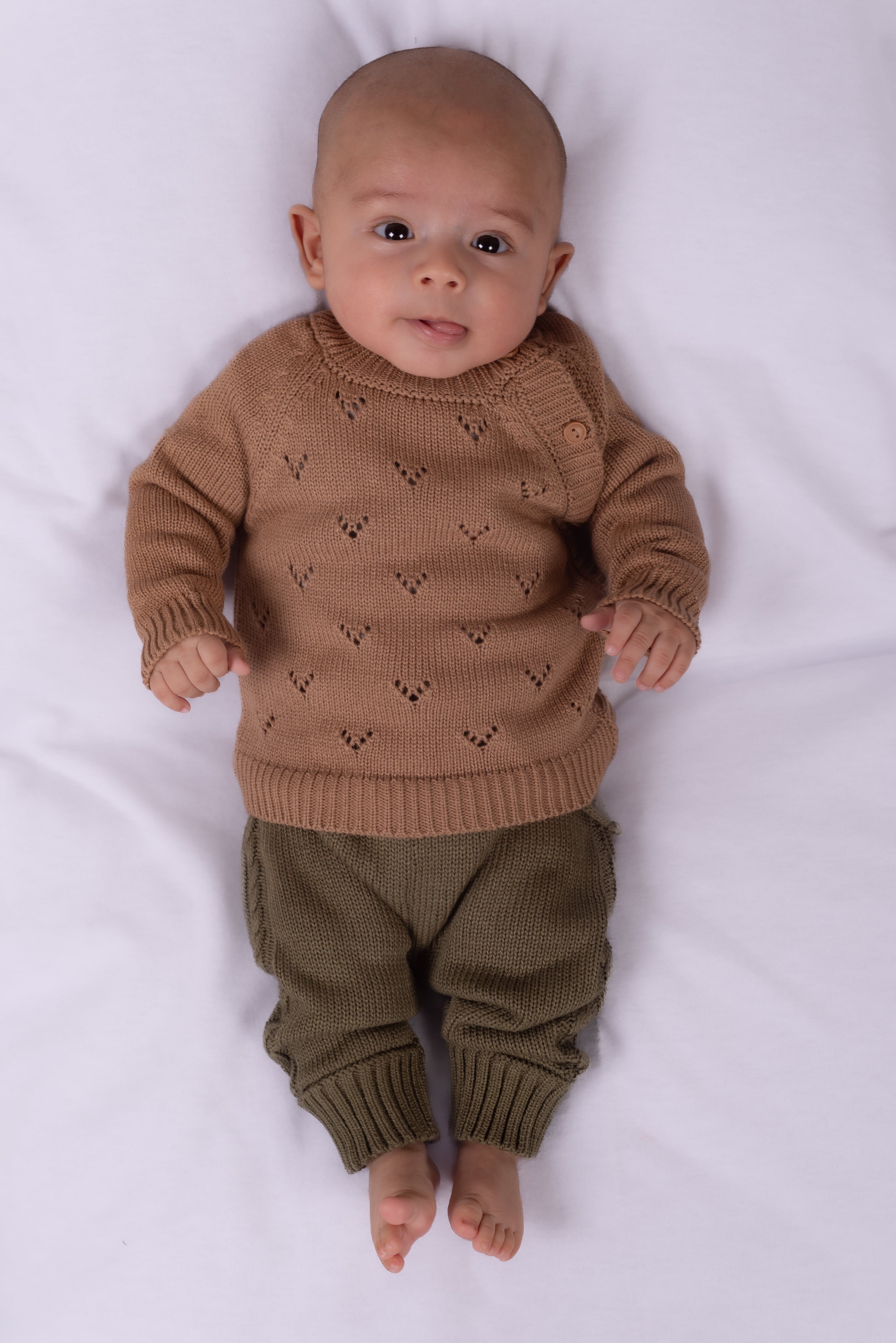 Un sweater tejido lleno de detalles para acompañar cada aventura de tu bebé. Este sweater en color camel está confeccionado en un tejido suave y abrigado, ideal para mantener a los peques cómodos en días frescos .